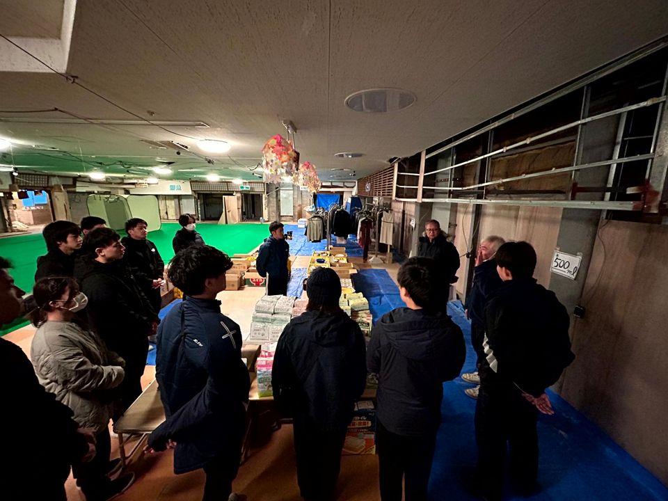 翌日は被災地の現状を見させていただくため、国道を走り、能登町方面へ。イカの駅、能登町役場、地元のラーメン屋を回りました。途中の海がきれいで、息をのんだのを覚えています。午後は町野町にもどり、もとやスーパーへ。2度の被災から再起し、11/11から仮オープンした町唯一のスーパーです。支援物資も受け入れていて、その搬入や掃除、値札付けなど行い、また本谷社長から貴重なお話を伺うこともできました。震災をチャンスにしたいと、スーパーの新しい計画を話しているときの楽しそうな顔が忘れられません。再開まで想像を絶する苦労を思うと、地域を守り支えるという強い意志を感じ、心を打たれました。
