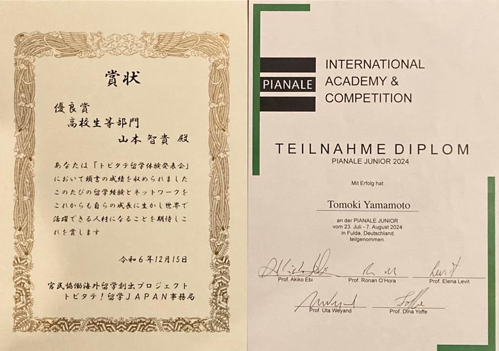 ・Pianale2024は、本場のショパンコンクールの審査員の方々をはじめとする、全世界で活躍するピアニストの方々のマスタークラスを中心としたピアノの留学プログラムです。山本くんは、全世界の応募者の中から僅か12名の参加メンバーに選出され、9回のマスタークラス+ドイツ語語学研修を中心とするコースを修了しました。