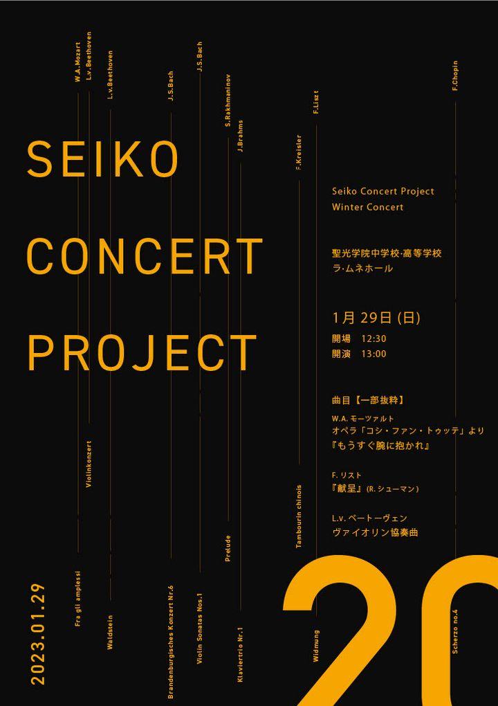 SCP(Seiko Concert Project)はコンサートを企画・運営する学校公認団体です。すばらしい音響設備やスタインウエイピアノなどを備えた 聖光学院講堂「ラ・ムネホール」で聖光生が演奏するコンサートを企画しています。今回のコンサートで20回目を迎えます。