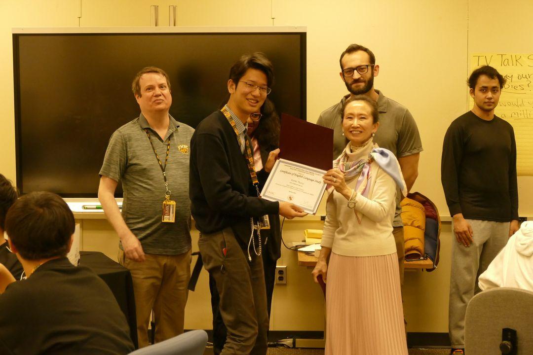 一週間が過ぎるのはあっという間で、私たちのUMBCでの滞在もいよいよ最終日を迎えました。午前は最後の英語の授業で、私たちのクラスでは「幸せ」と「アメリカ合衆国の選挙制度」について議論しました。アメリカの時事問題についても触れることができ、最後まで充実した時間を過ごすことができました。午後には修了セレモニーが催され、私たちは修了証書を受け取り、飲み物とケーキを楽しみました。また、日本語を勉強しているUMBCの生徒との交流の機会もあり、それぞれの趣味や日米の文化の差などについて話すことができました。放課後、私はTrue Grit’s(食堂)にて、毎日のように食べていたピザを最後にいただき、大学に別れを告げました。一週間という短い期間でしたが、暖かく迎えてくださったUMBCの先生、スタッフ、学生のみなさん、ありがとうございました。この研修での経験を活かし、今後の学習に繋げていけるようこれからも頑張ります。