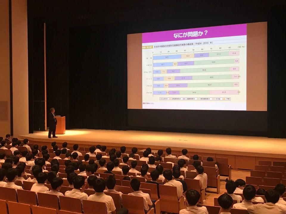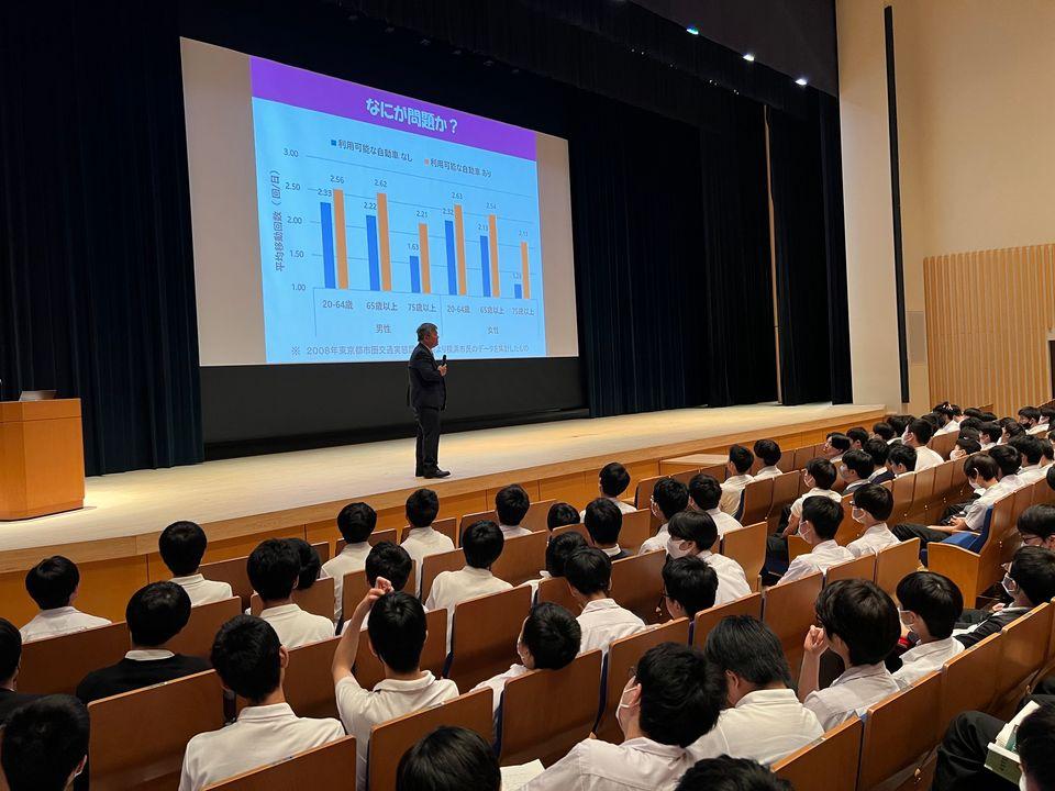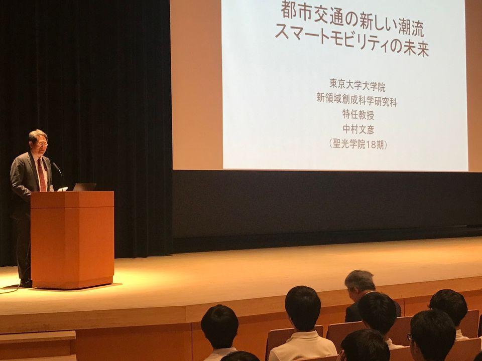 6/24の講師は、東京大学大学院新領域創成科学研究科特任教授の中村文彦先生(18期卒業)でした。都市交通を専門とする中村先生からは、都市交通の新たな潮流やスマートモビリティの未来について、国内外のさまざまな例をあげて説明がありました。スライドの写真の解釈など随時発せられる質問に順番に生徒が答えていくというスタイルで講義が進められたので、生徒たちも考えながら聞くという結果になりました。交通について考える場合に環境や地域課題、健康で文化的な生活など広い視点からとらえることの重要性が指摘され、生徒たちも納得していました。今回の講座は、第9回聖光アカデミックセミナーとして実施されました。司会をつとめた九州大学副学長の佐々木一成氏(20期)、挨拶をいただいた栗原研一会長・上坂充副会長をはじめアカデミアの会のみなさまに感謝申し上げます。