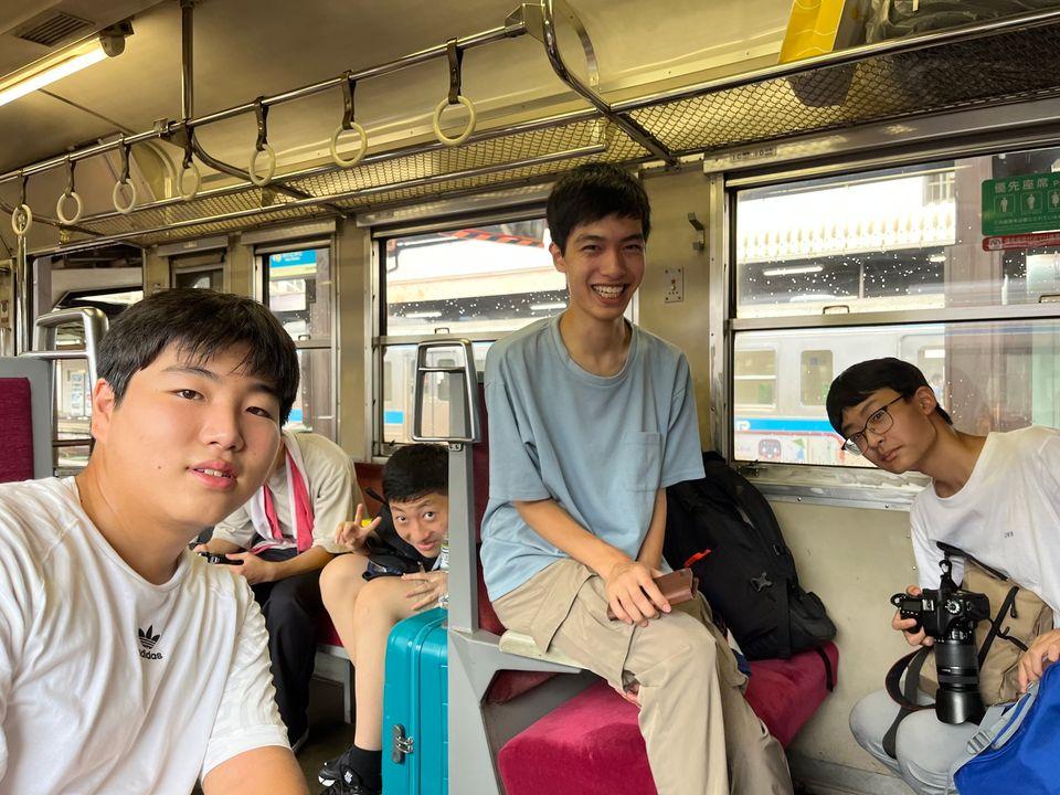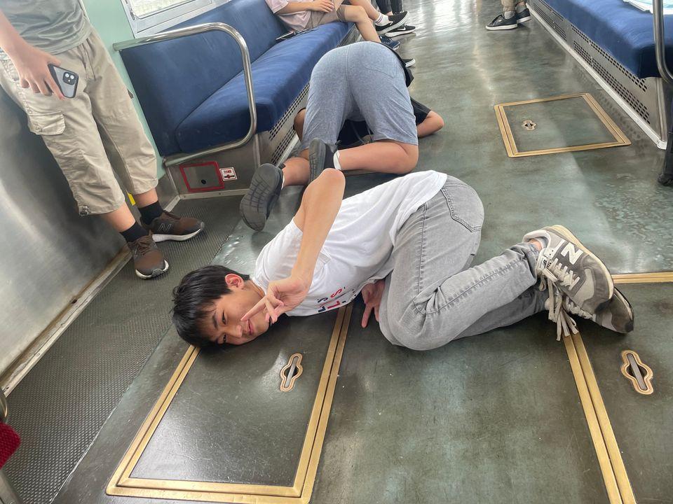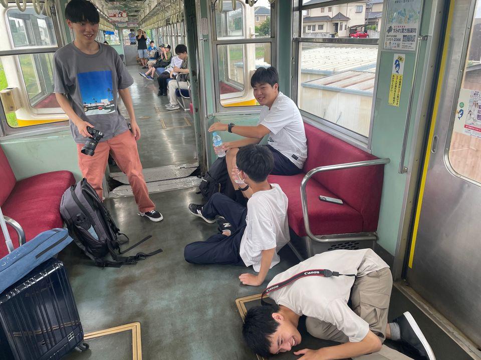列車の中では、床に耳を近づけてモーター音を聞くなど、普段の車内ではできない方法で研究をしている生徒もいました。