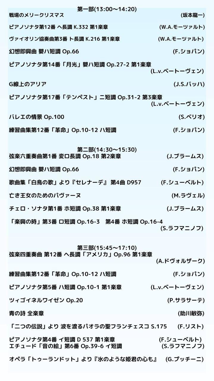 中1〜高2までの有志が、ピアノや弦楽器、声楽などの数々の名曲を演奏いたします。