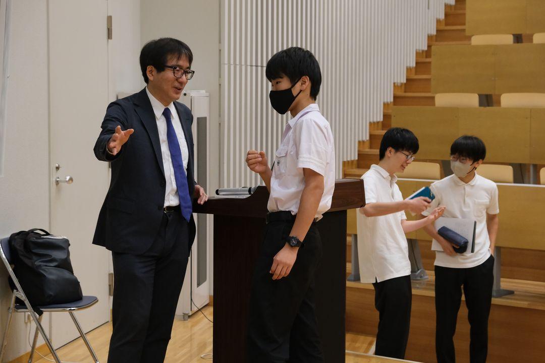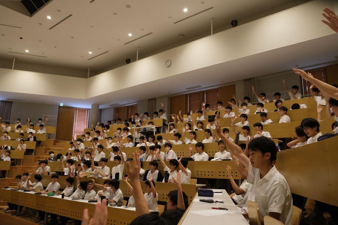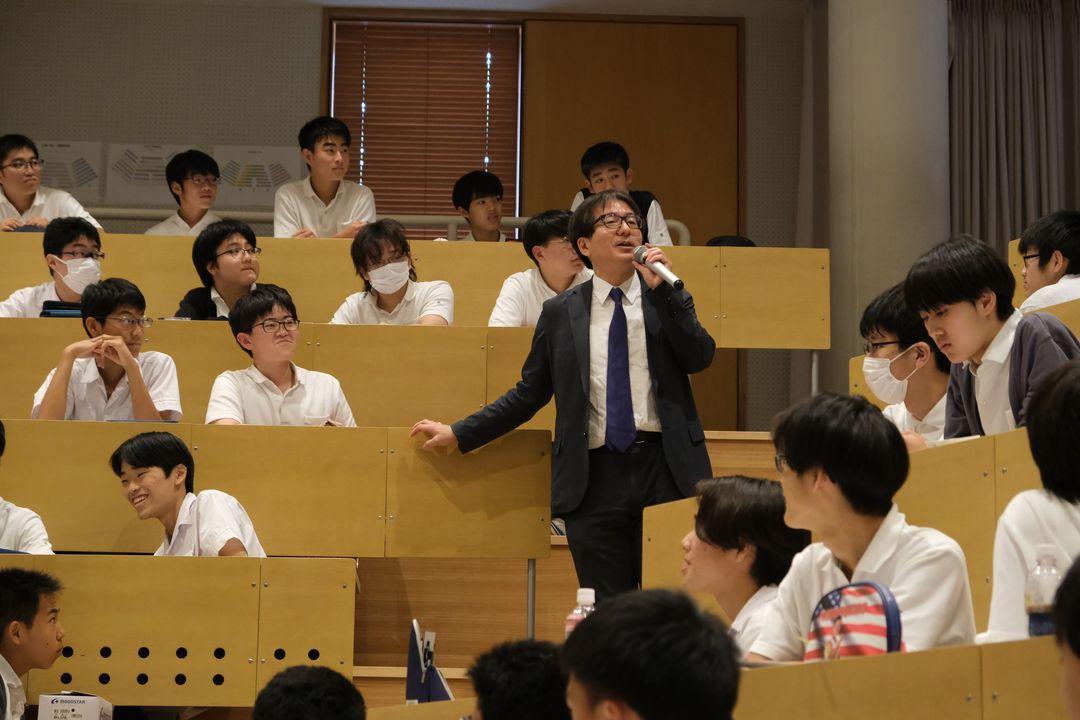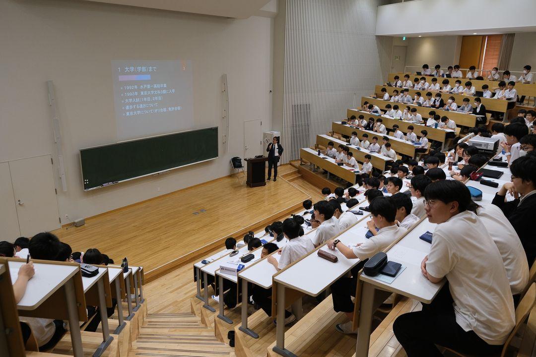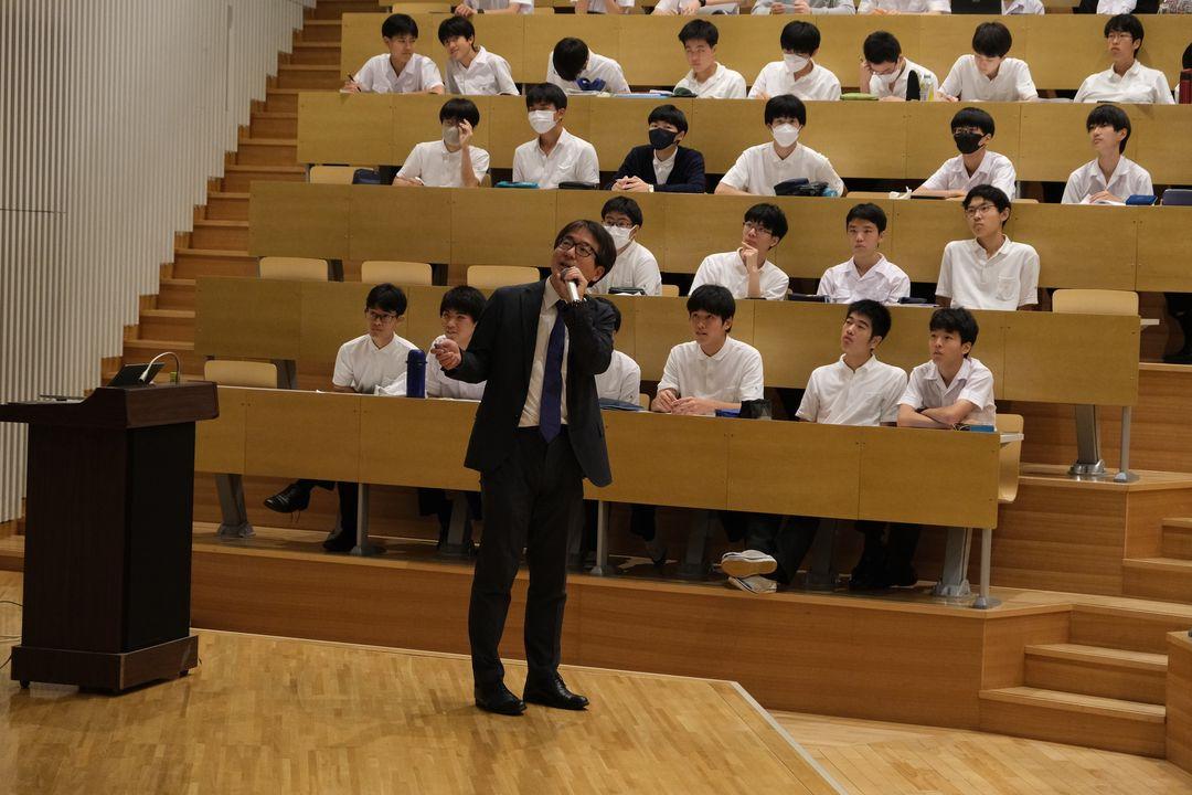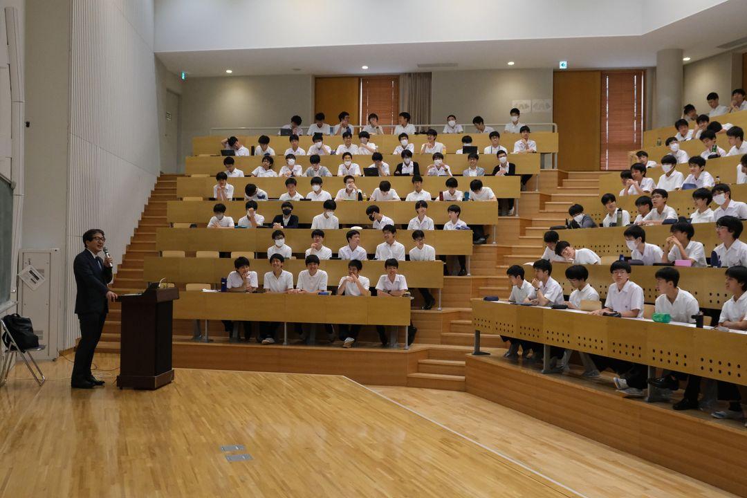 6/29の講師は、弁護士・弁理士の竹内亮氏でした。竹内さんは東京大学文学部を卒業後、朝日新聞社に入社、校閲や紙面編集に従事した後に退社し、法科大学院を経て弁護士になったという経歴の方です。前半は大学での学生生活がユーモアを交えて紹介され、笑いがあちこちでおきました。また、校閲や編集という仕事を具体例を挙げながら説明していただいたことで、いかに新聞が信頼を保つために厳密に作業が行われているかを知りました。後半は法律について、殺人または過失致死のどちらになるかなど、クイズ形式で話が進められ会場が盛り上がりました。正解の意外さとその解釈を聞き、法律の奥深さを感じた生徒も多くいたようです。苦労もあったといいながら明るく人生を語る竹内さんの姿をみて、学び続けることの大切さを思ったり、自身の将来に可能性の広がりを感じたりと、生徒たちにとってとても満足度の高い講演でした。
