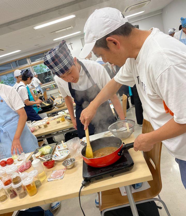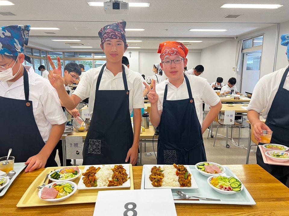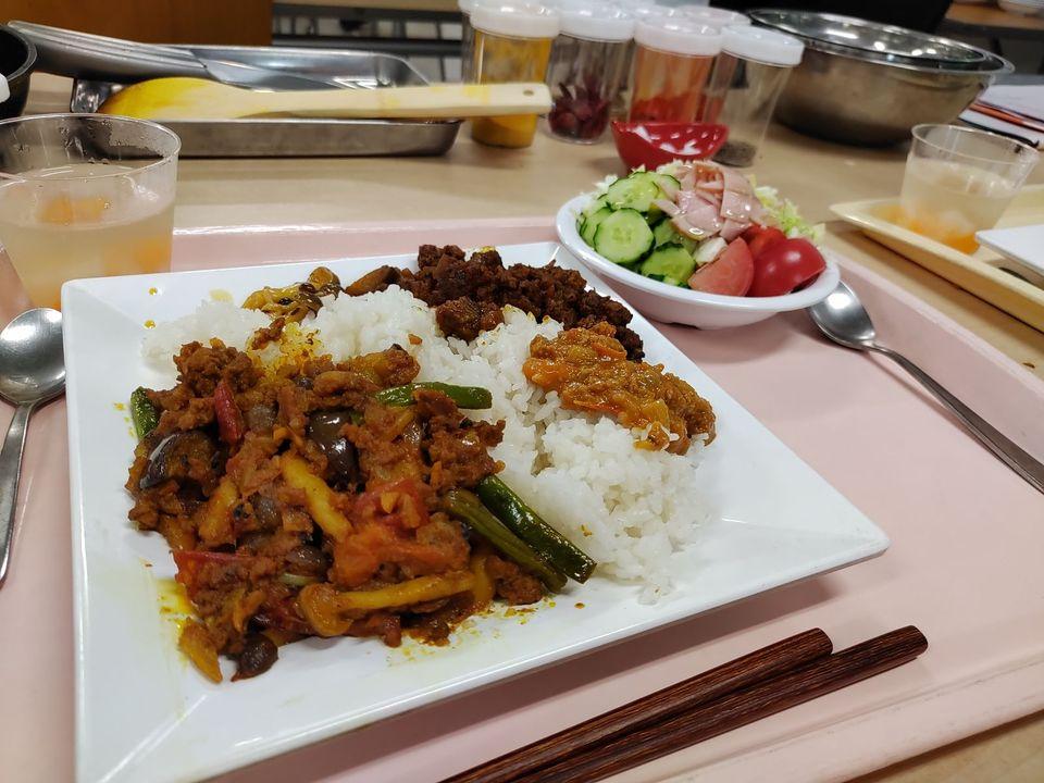 作った料理は自分好みのスパイスカレーと野菜サラダです。2人1組となって協力して作りました。スパイスの調合はもちろん、食材の切り方や調理行程、すべて自分で考えます。盛り付けにデザインセンスが光っているお皿もありました。